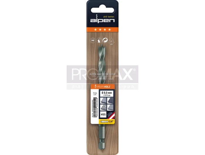 מקדח עץ מפלדת HSS עם חיבור משושה לאימפקט ALPEN